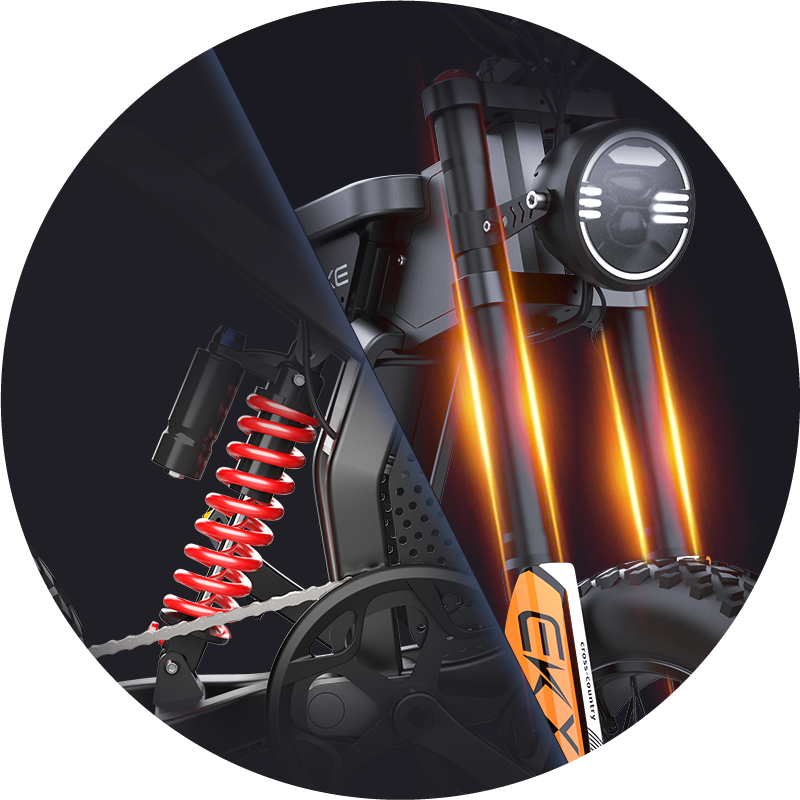 Full-suspension shock absorbers front and rear absorb shock on rough terrain to increase comfort and reduce rider fatigue. Improves traction and control for a smoother ride on uneven surfaces.